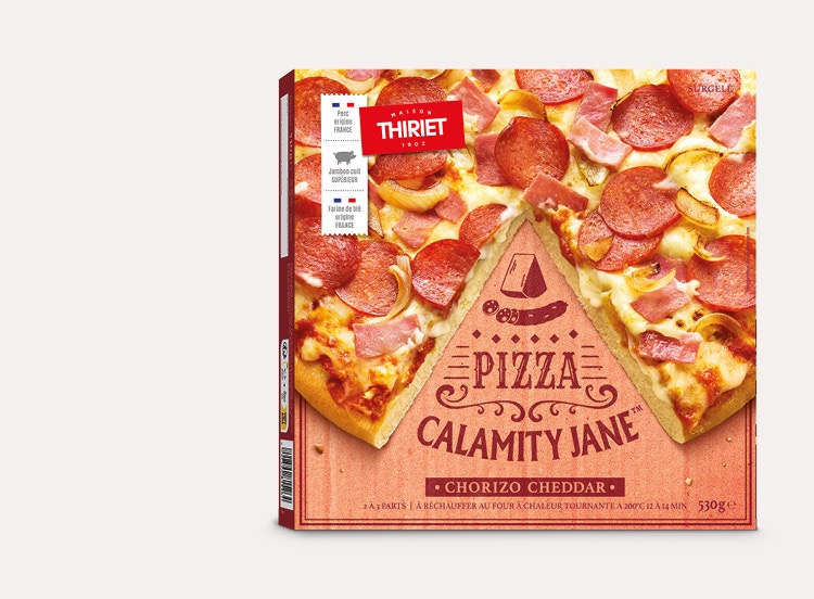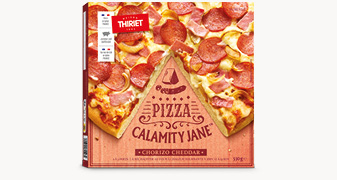 Farine de blé (gluten (Blé)) (origine France) 32,1%, eau, chorizo fumé au bois de hêtre 7,5% (viande de porc (porc né, élevé et abattu en France) 6,8%, lard (porc né, élevé, abattu en France) 0,3%, sel, épices, dextrose, sirop de glucose, préparation aromatisante, extrait d'épices, antioxydants : extraits de romarin - acide érythorbique - érythorbate de sodium, fumée), cheddar 7,5% (lait), purée de tomate 6,4%, mozzarella 5,6% (lait), jambon cuit supérieur fumé 5,7% (jambon de porc (origine France) 5,3%, eau, sel, arômes naturels, antioxydant : acide ascorbique), oignon grillé 5,6%, oignon blanc, poivron rouge 2,3%, huile d'olive vierge extra, levure de boulangerie, sel, épices et plantes aromatiques, sucre, amidon
