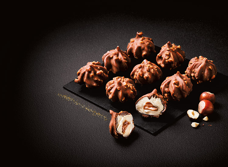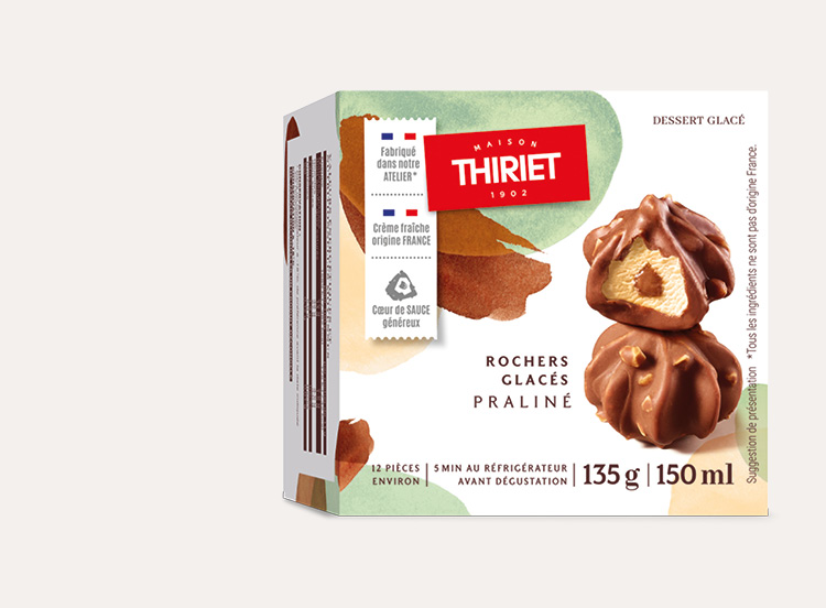 De savoureuses bouchées glacées composées d'une crème glacée praliné noisette à la crème fraîche, d'un cœur de sauce au praliné noisette, enrobées de chocolat au lait avec des éclats de noisette.