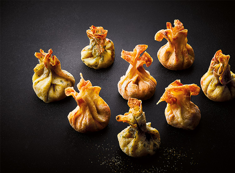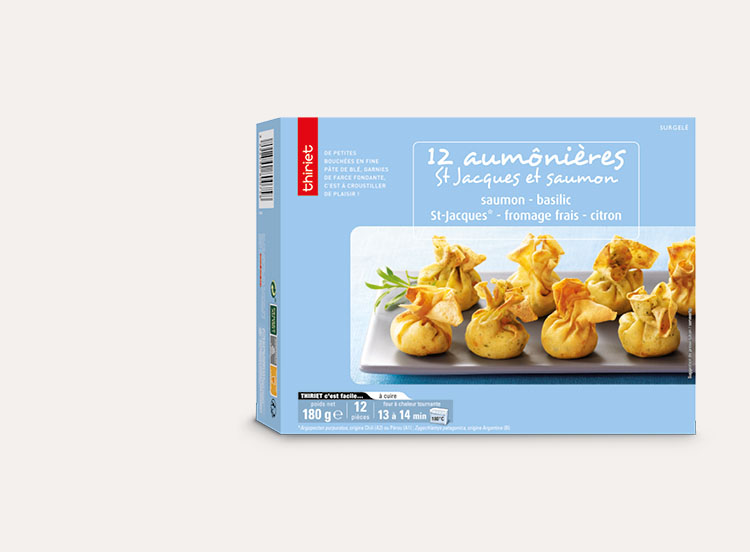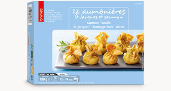 Pâte de blé 33% (eau, farine de blé (gluten), huile de tournesol, blanc d'œuf de poules élevées en plein air en poudre (oeufs), basilic 0,4%, œuf de poules élevées en plein air en poudre (oeufs), sel), saumon Atlantique (poisson) 15,7%, noix de Saint-Jacques (mollusques) 15,4%, fromage frais (lait) 12,9%, crème (lait) 6,5%, eau, beurre (lait), huile d'olive vierge extra, tomate semi-déshydratée, amande en poudre (fruits à coque), citron confit 0,7% (citron, sucre, eau, acidifiant: acide citrique, antioxydant: acide ascorbique), fibre de blé (gluten), pulpe de citron 0,6%, chapelure (farine de blé (gluten), levure, sel), blanc d'œuf de poules élevées en plein air en poudre (oeufs), sel, basilic 0,4%, aneth 0,4%, piment de cayenne