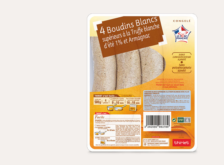 Lors de repas festifs, dégustez ce savoureux boudin blanc, une recette charcutière gastronomique avec viande de porc, brisures de truffes blanches et Armagnac. Ce boudin est garanti sans polyphosphate ajouté et sans conservateur ajouté.