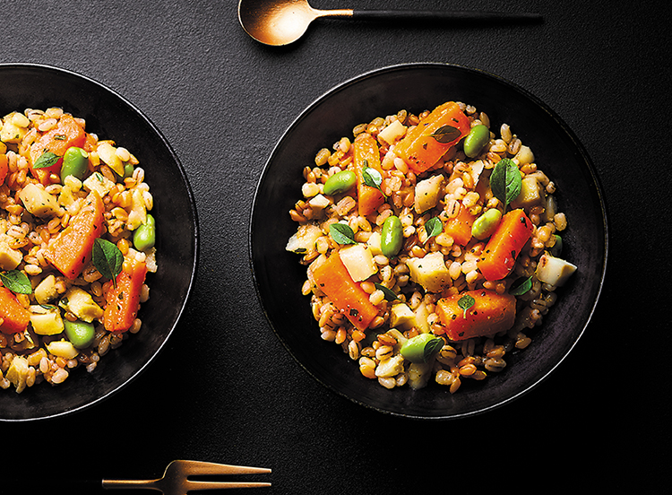 Cette poêlée d'orge perlé et petit épeautre origine France aux fonds d'artichauts, cubes de butternut et fèves de soja est délicatement assaisonnée à l'huile d'olive et au jus de mandarine de Sicile.